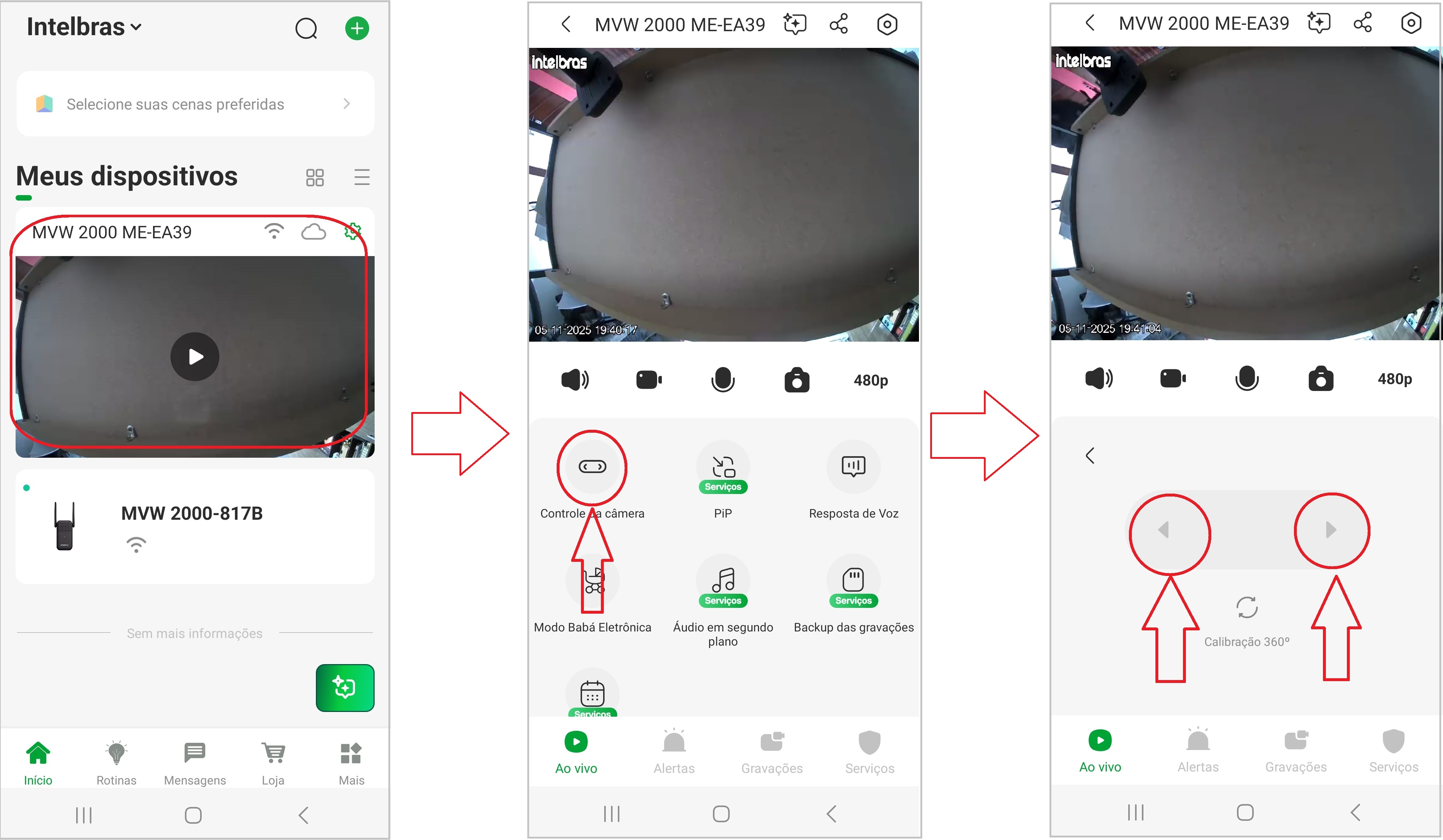 Após selecionar o dispositivo, o usuário é direcionado para a tela com a transmissão ao vivo da câmera. Na parte inferior, são exibidas várias funções, entre elas o botão “Controle da câmera”. Esse botão deve ser tocado para acessar os comandos de movimentação.