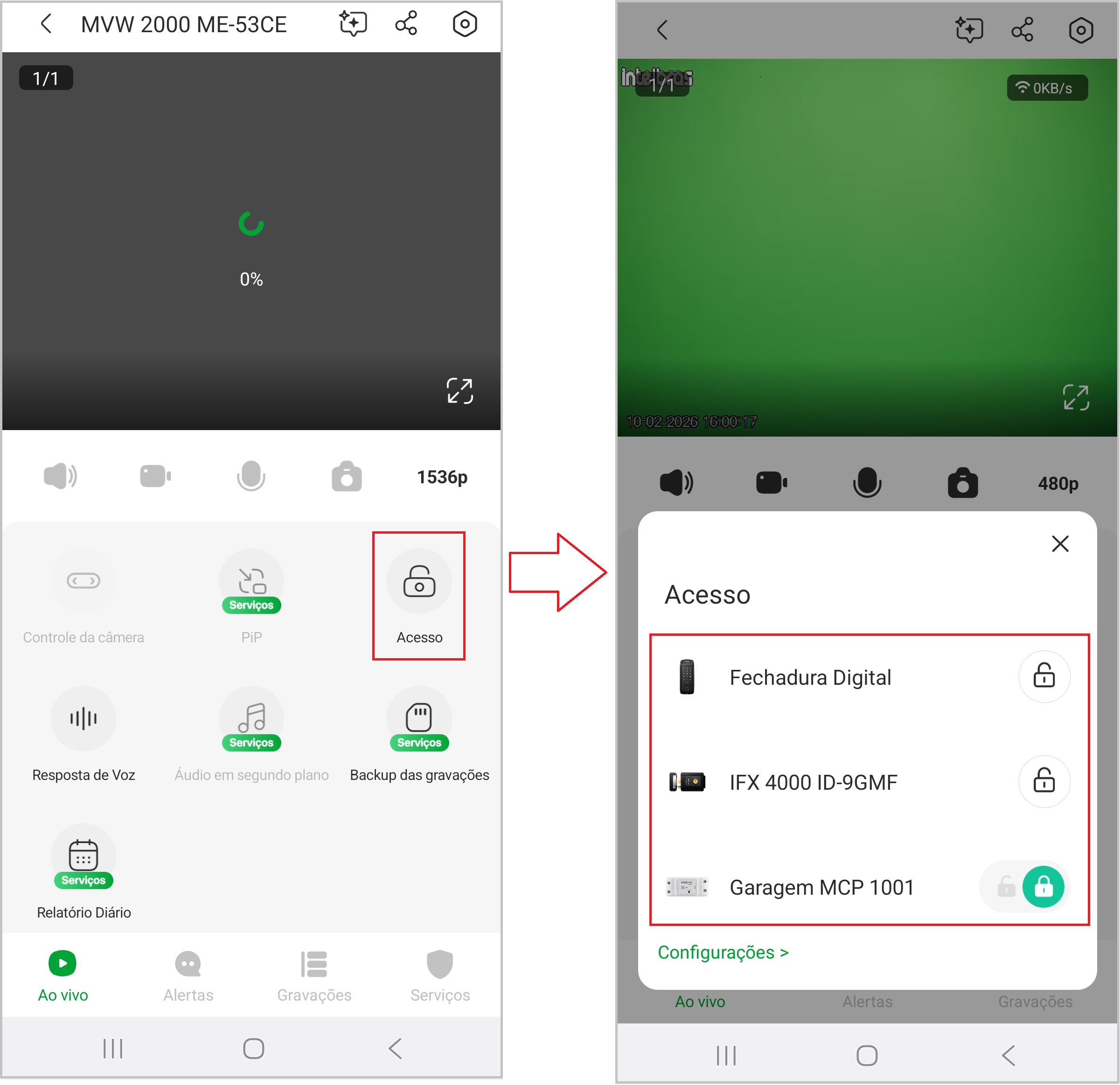 • Uma vez vinculados, eles ficam disponíveis tanto na tela de monitoramento ao vivo quanto durante o atendimento de uma chamada do videoporteiro.