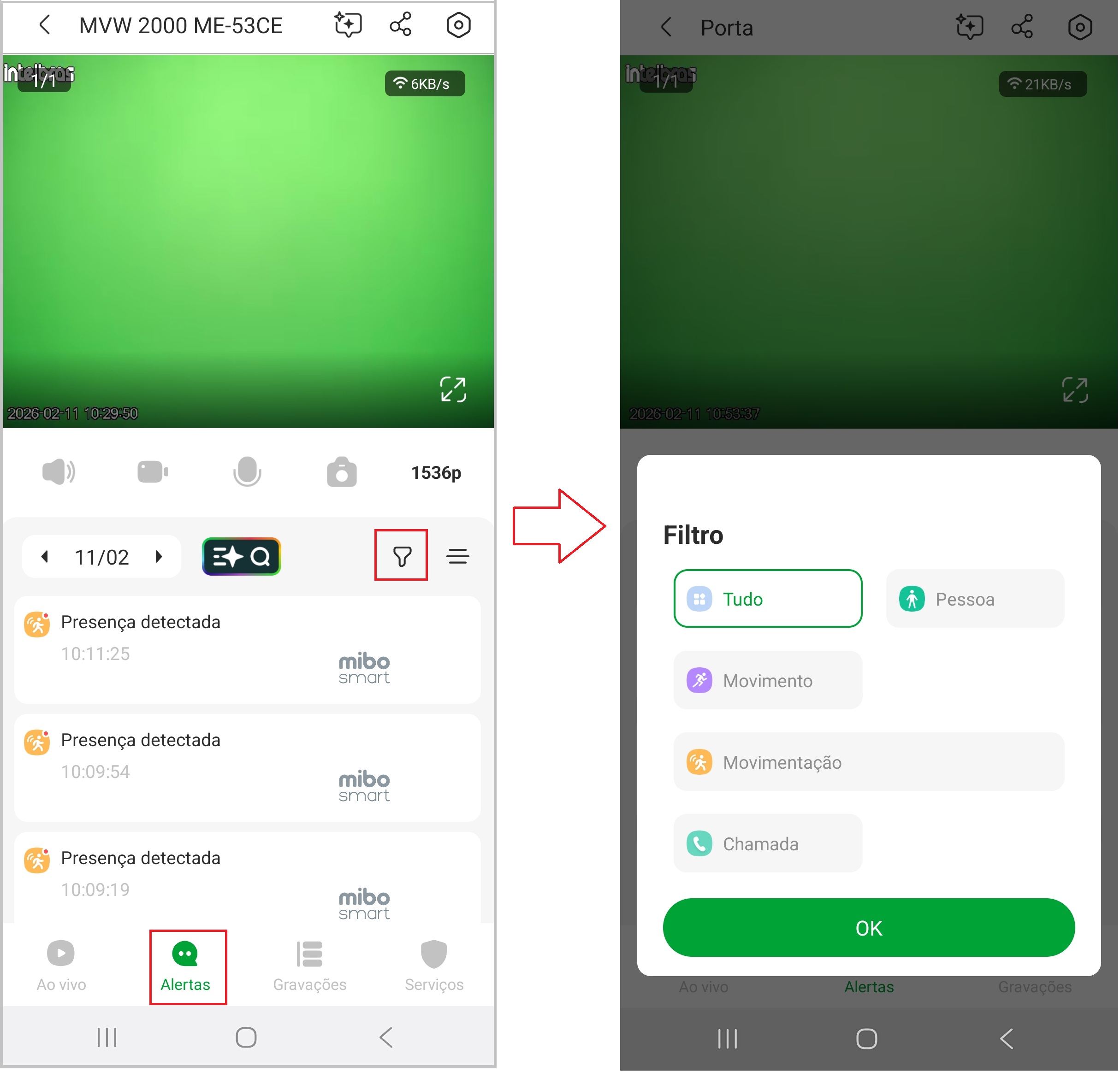 É possível filtrar por tipos de eventos, como chamadas, detecção de um movimento qualquer ou somente de pessoas. Utilize o ícone de filtro para selecionar um ou mais tipos de eventos e visualizar somente as notificações relevantes para você.