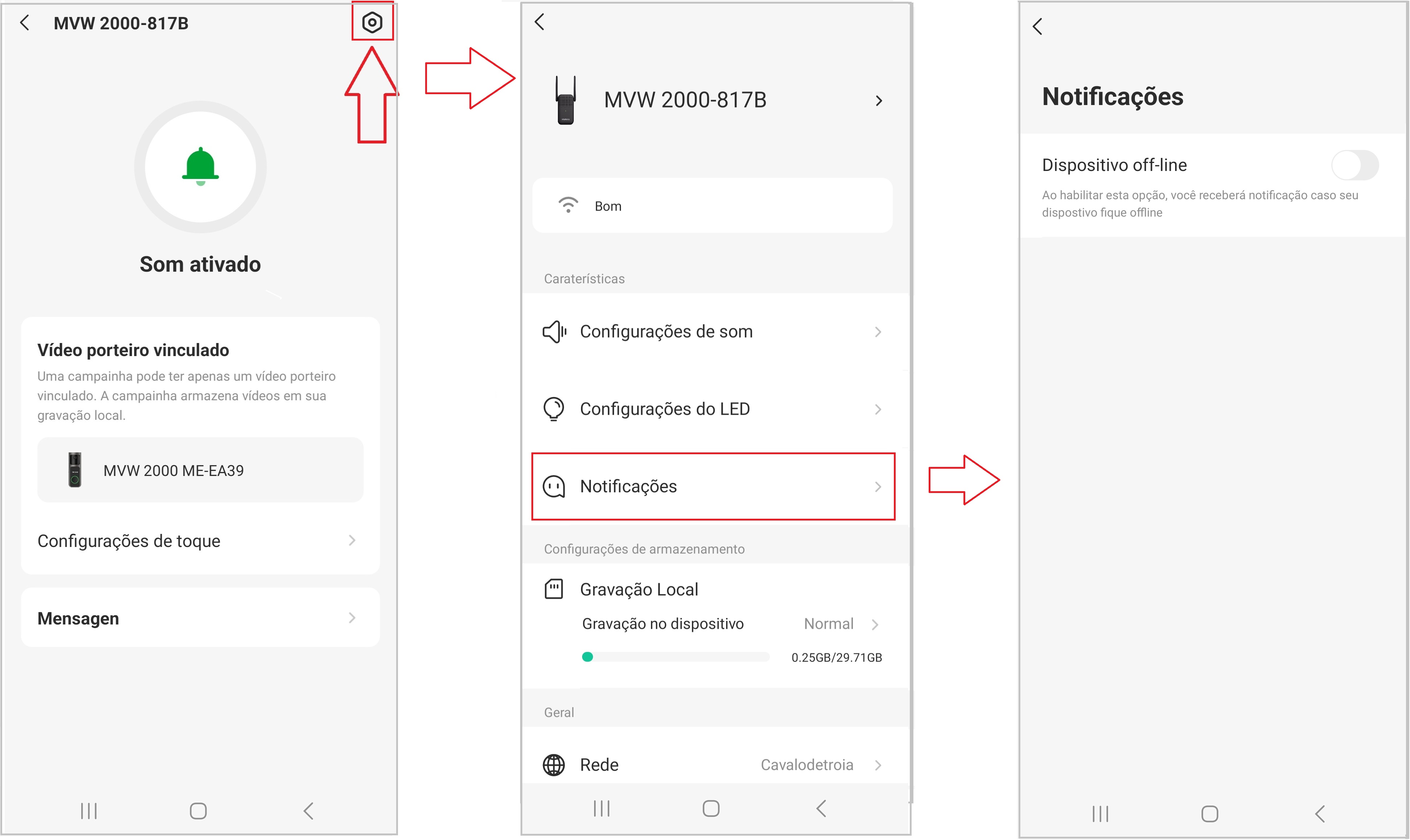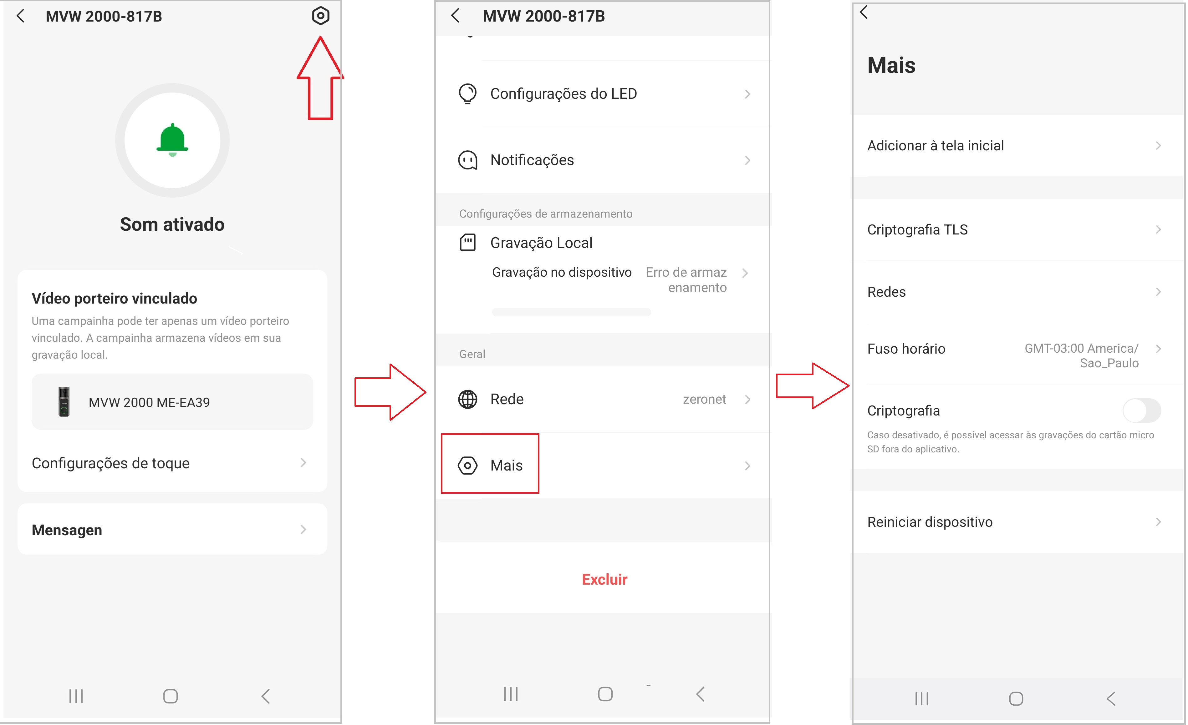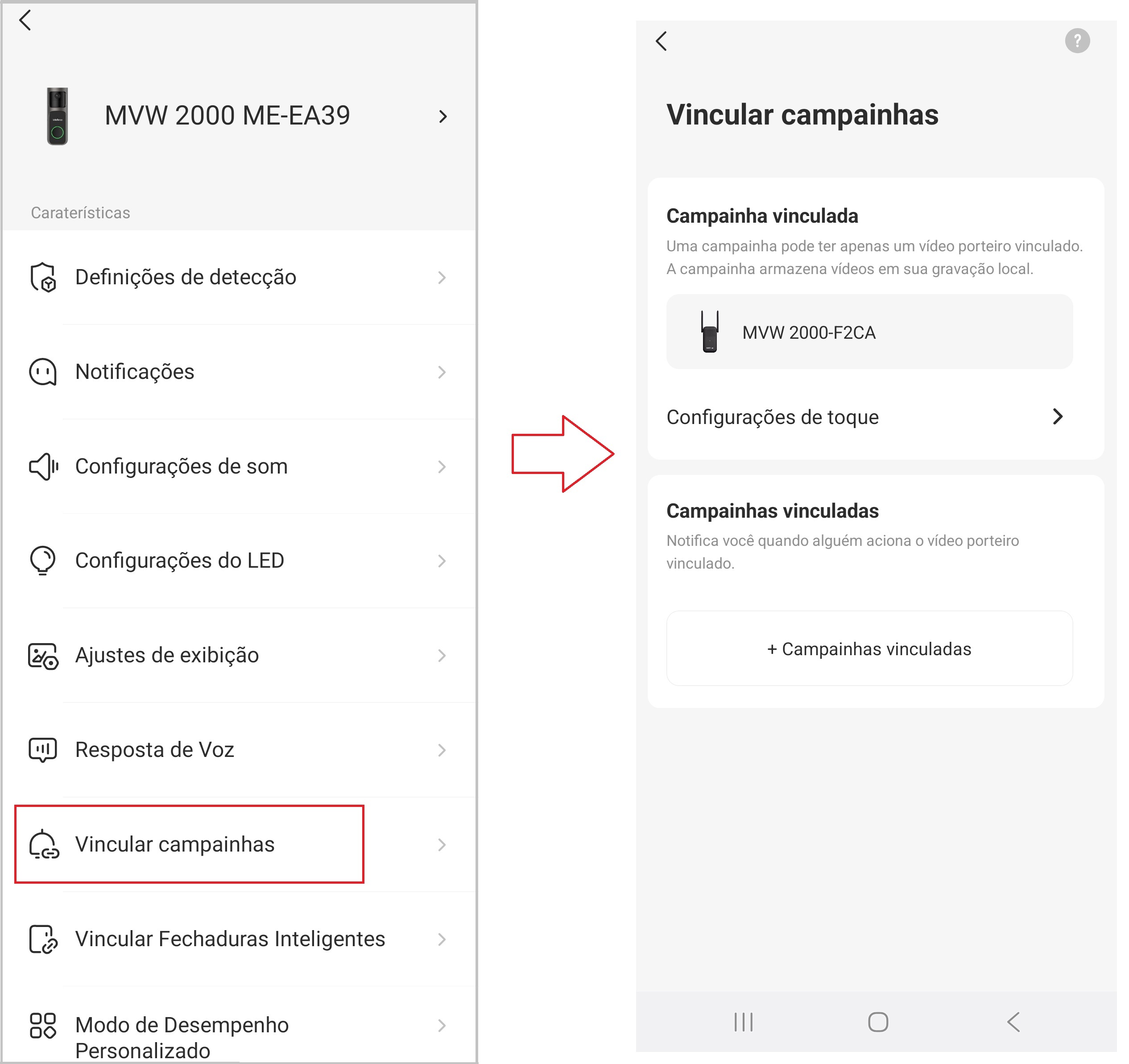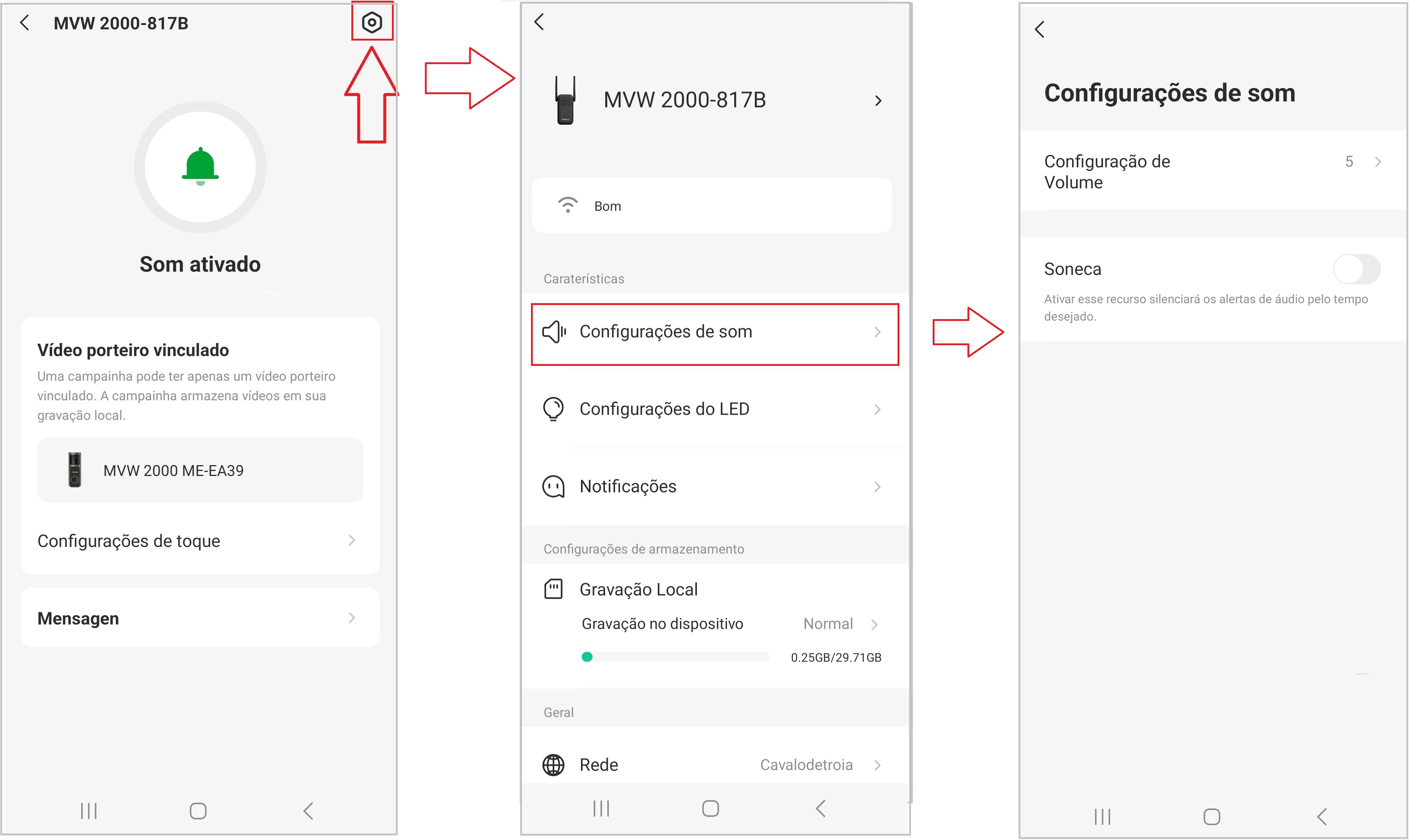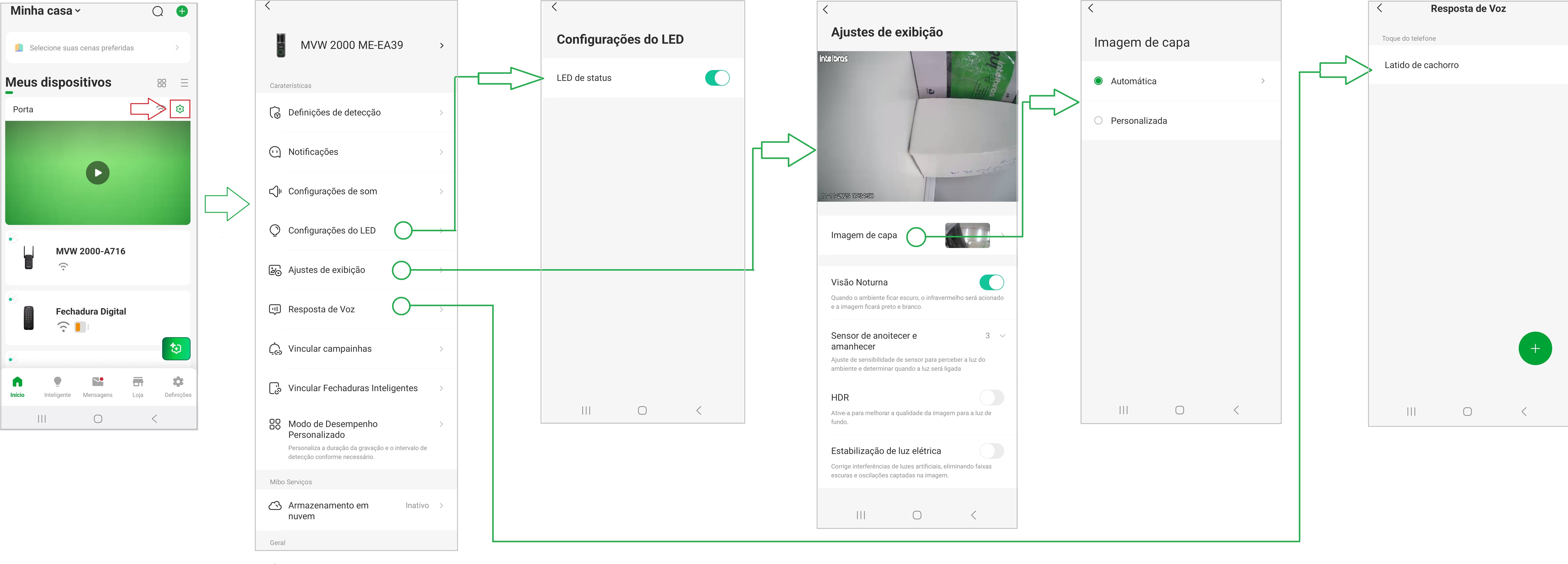 As configurações do videoporteiro permitem ajustar como a câmera detecta eventos, envia alertas e reproduz sons. A seguir, veja como acessar cada função conforme mostrado no aplicativo.
