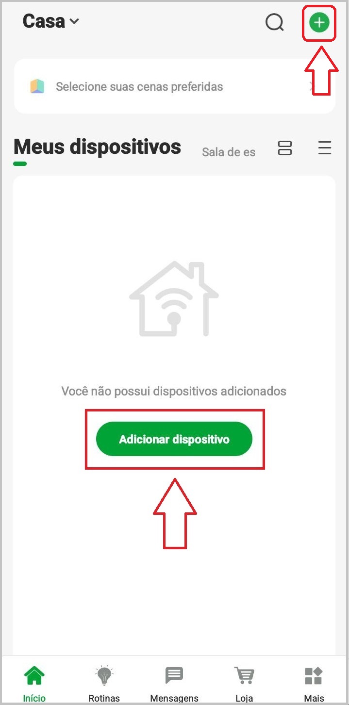 No menu principal do aplicativo, você visualizará todos os dispositivos cadastrados, poderá adicionar novos produtos, aba de rotinas, mensagens gerais do App, acesso a Loja e demais menus do App.
