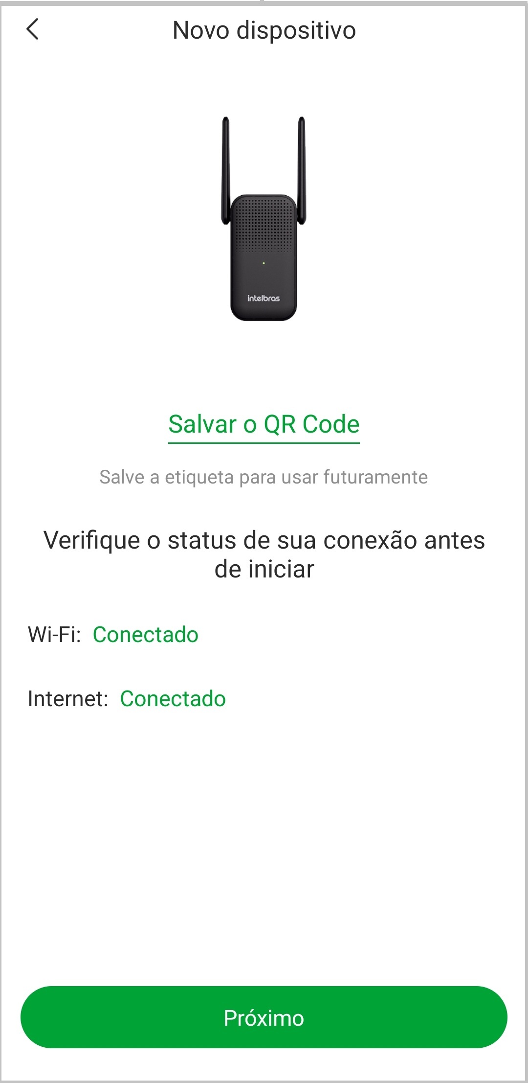 Nesta tela você pode acessar o QRcode e salvá-lo no celular. Este QRcode é o mesmo que está na campainha e permite adicionar o produto no app por ele.