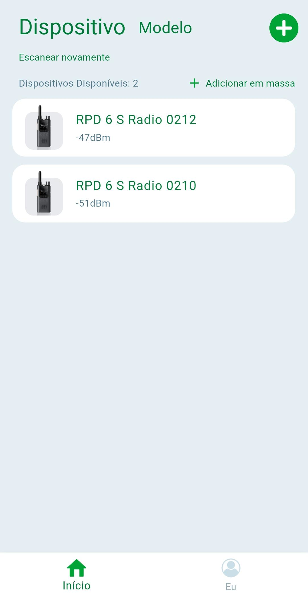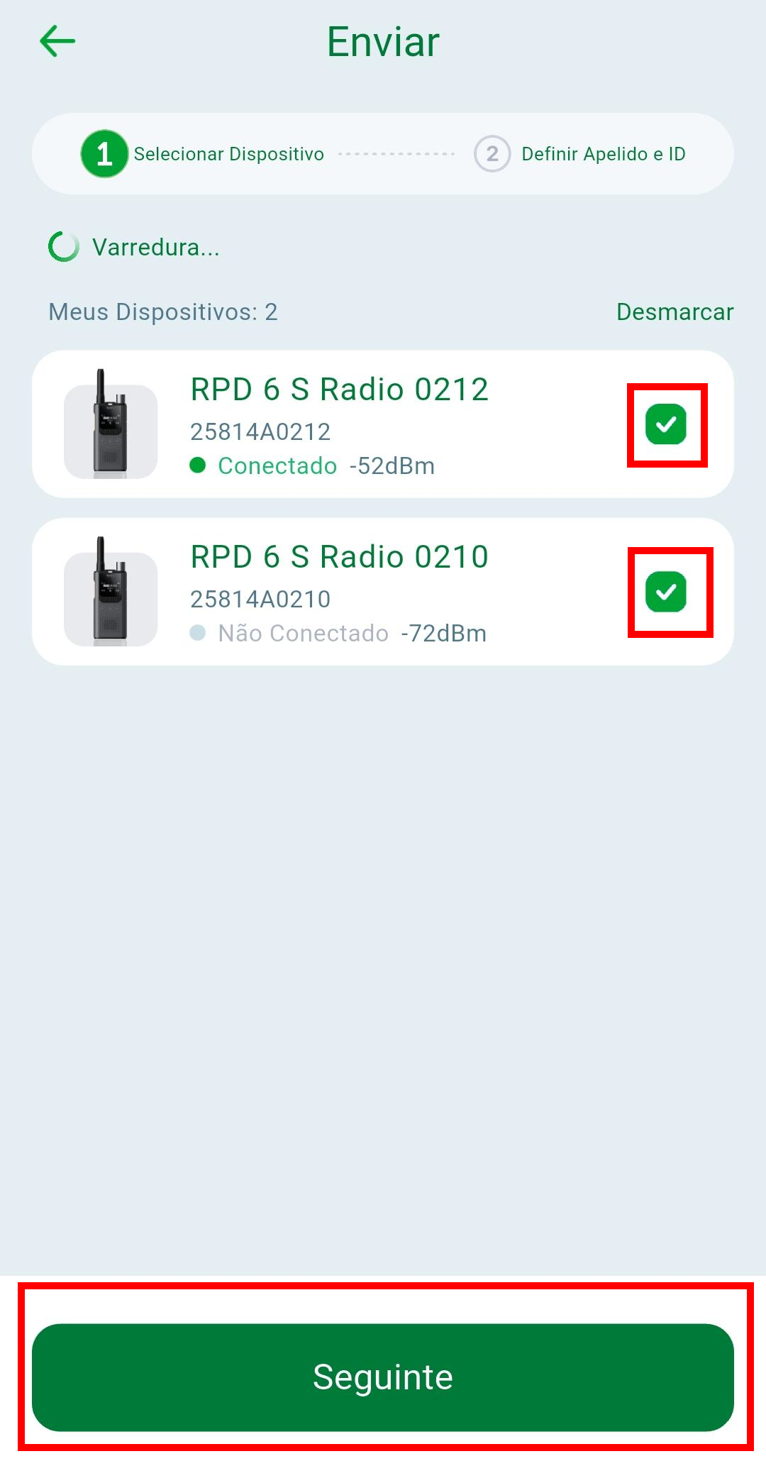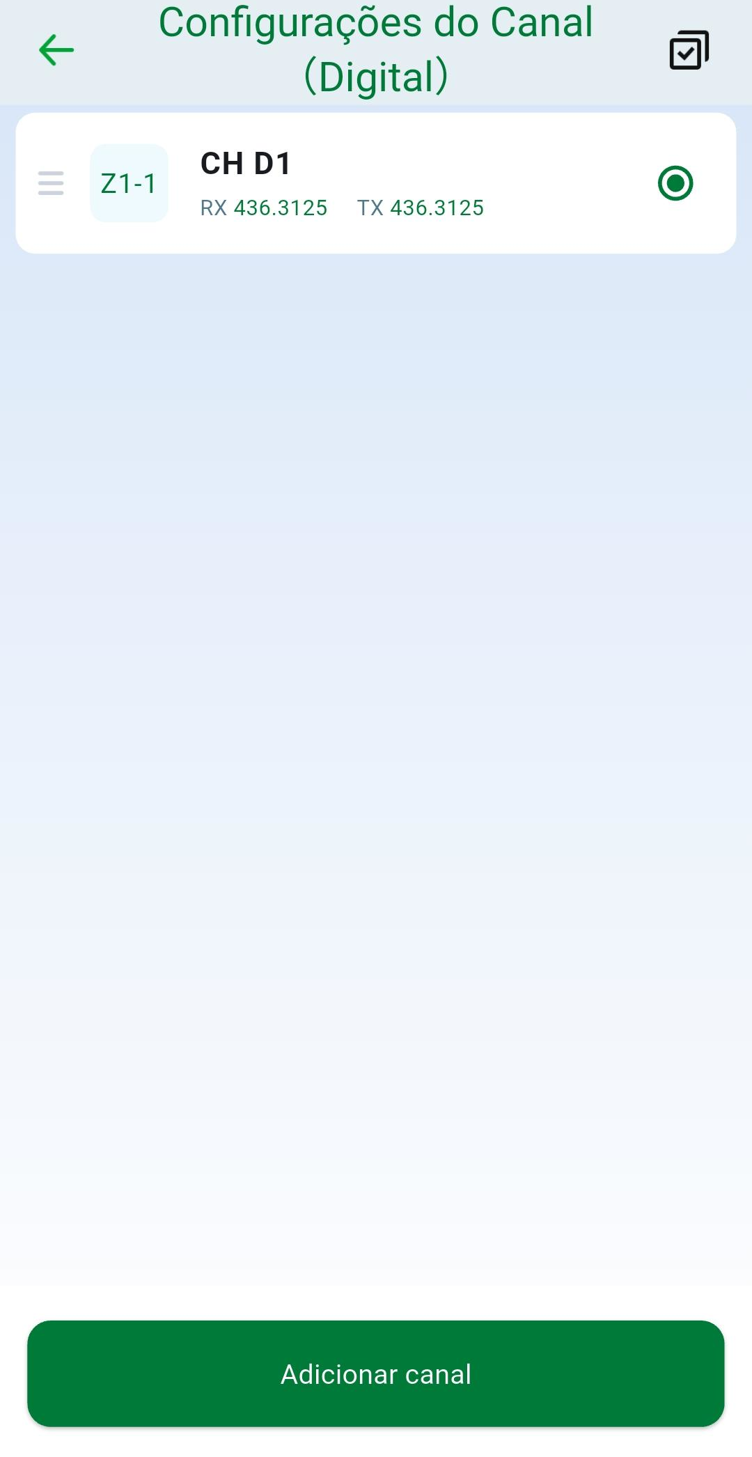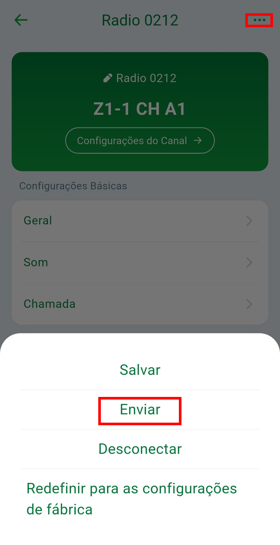 Todas as configurações efetuadas no aplicativo são aplicadas no rádio em tempo real, não sendo necessário o envio posterior. Caso queira enviar as configurações para multiplos rádios ao mesmo tempo clique em ... na parte superior da tela, e em seguida acesse a opção "Enviar".