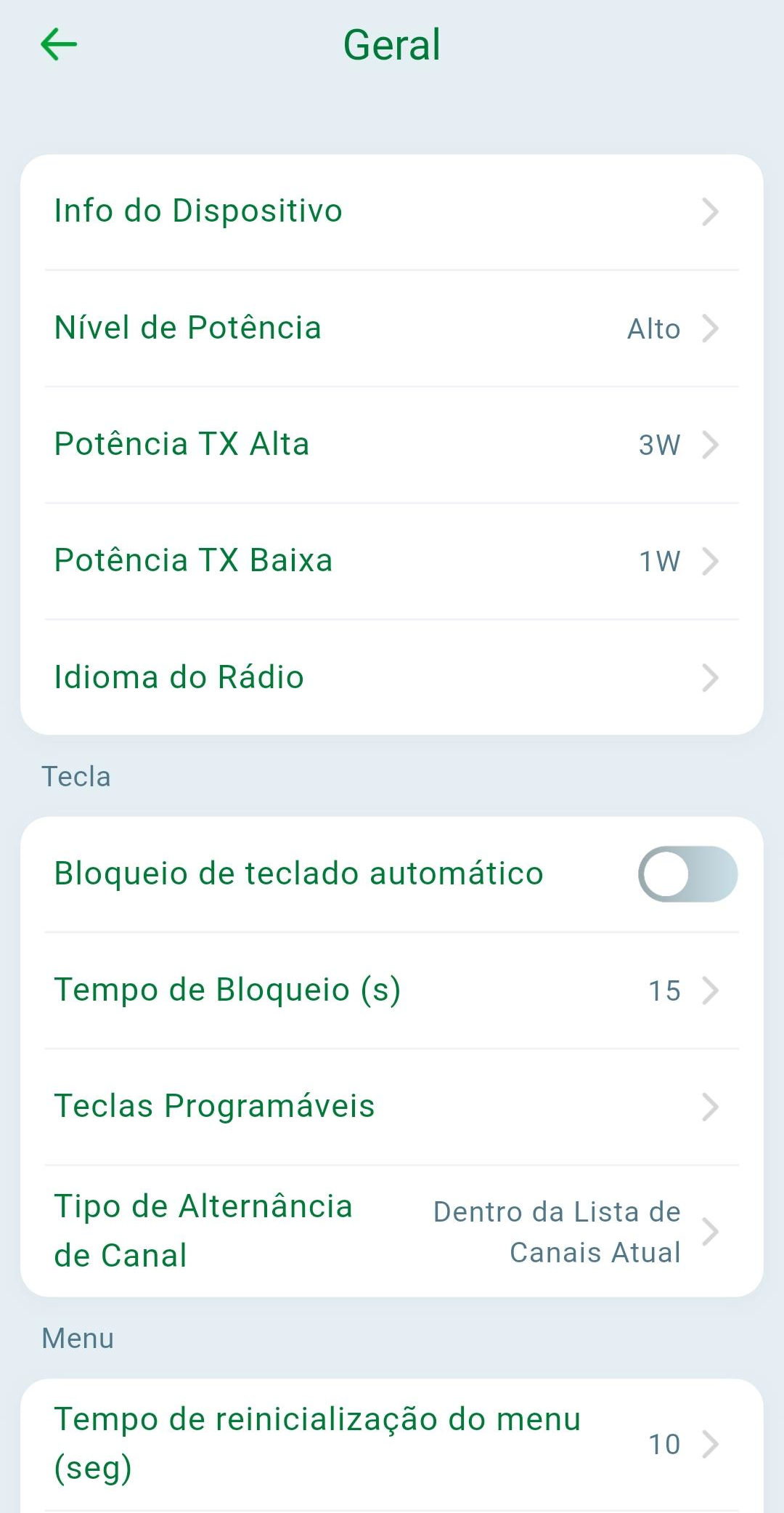 Tempo de reinicialização do menu (seg): Tempo em segundos para que o rádio permanece no menu quando há inatividade.