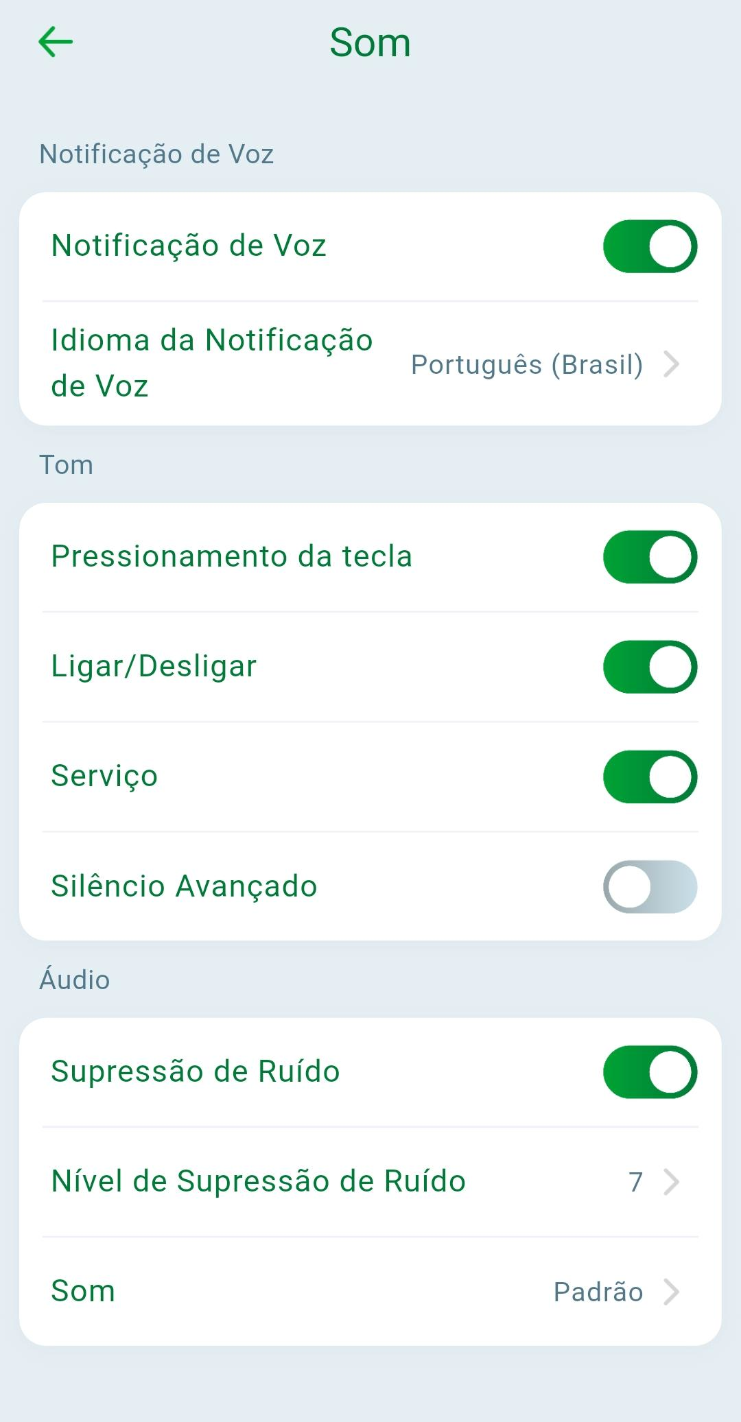 Na opção "Som" é possível realizar a configuração de idioma de notificação de voz, tons e supressão de ruído.