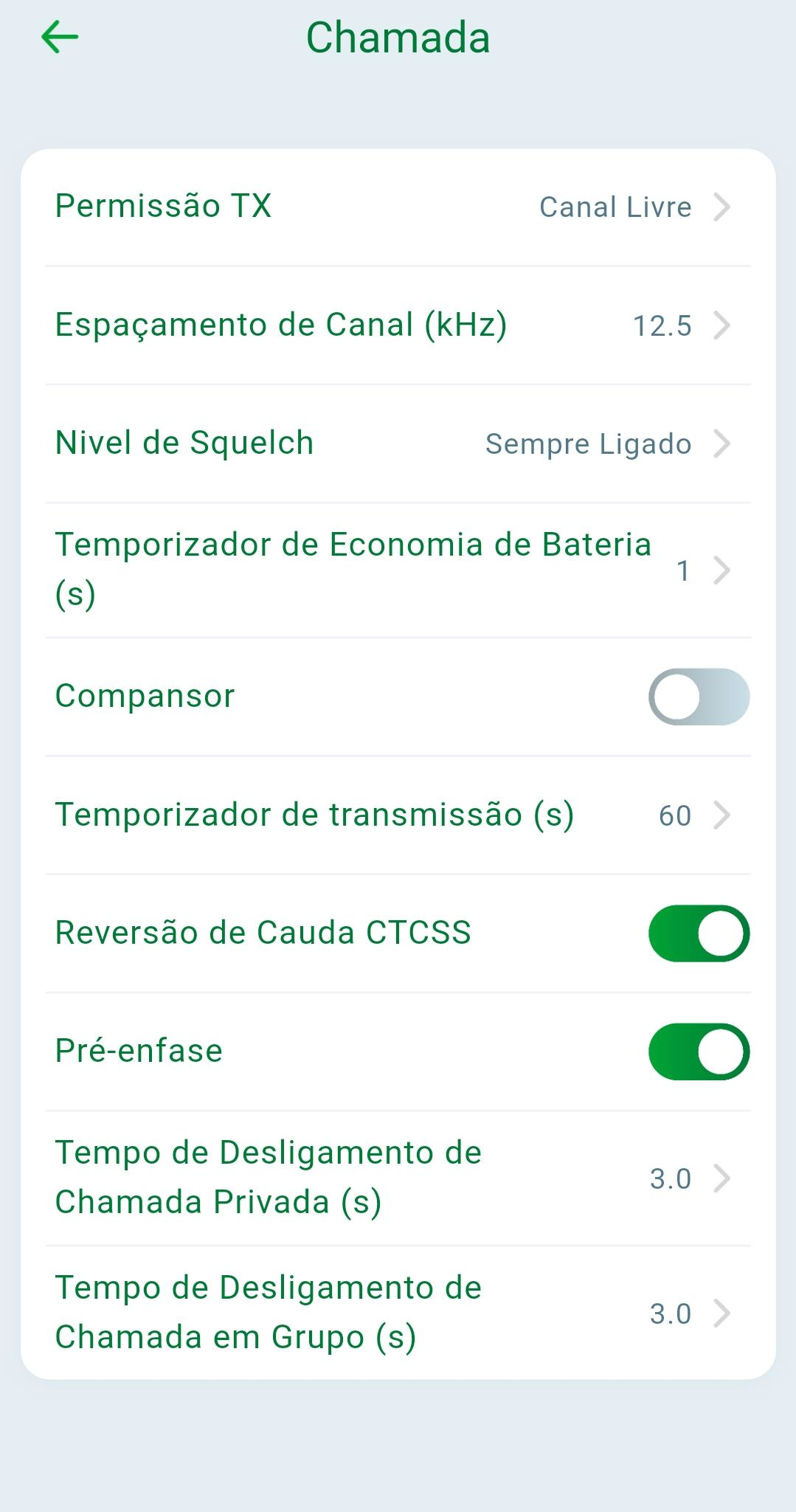 Na opção "Chamada" é possível realizar a configuração de parâmetros de transmissão e recepção, como por exemplo a permissão de transmissão, espaçamento do canal, Nível do squelch, temporização de transmissão e entre outros.