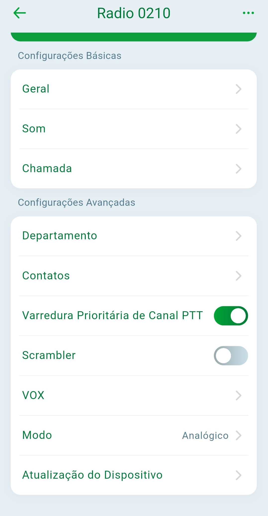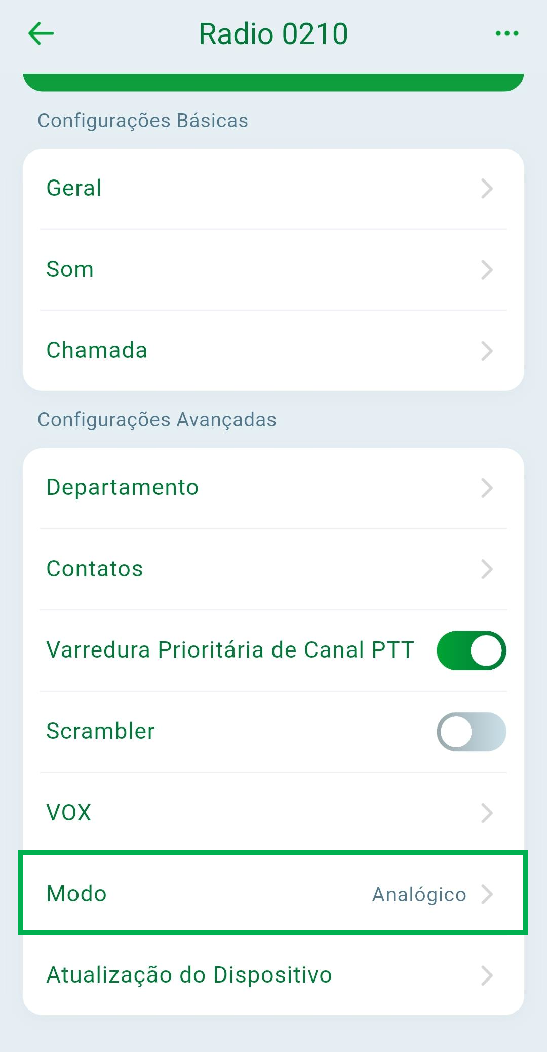Atualização do dispositivo: Permite atualizar o firmware do rádio sempre que uma nova versão estiver disponível. Quando isso ocorrer, um ícone vermelho aparecerá ao lado do nome da opção, indicando que há uma atualização pendente.