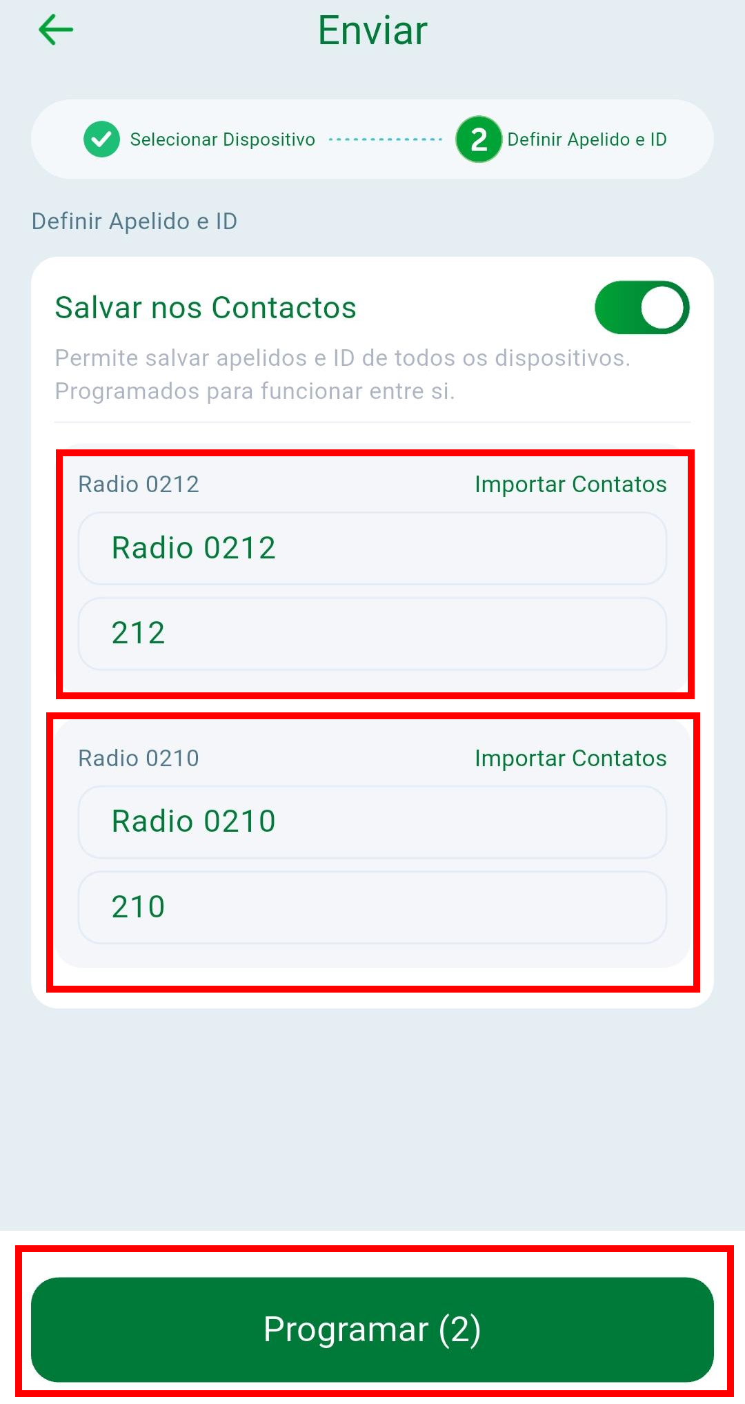 Será apresentado uma tela onde será possível definir o nome e o ID de cada um dos rádios. Após a configuração dos nomes e IDs, clique em "Programar".