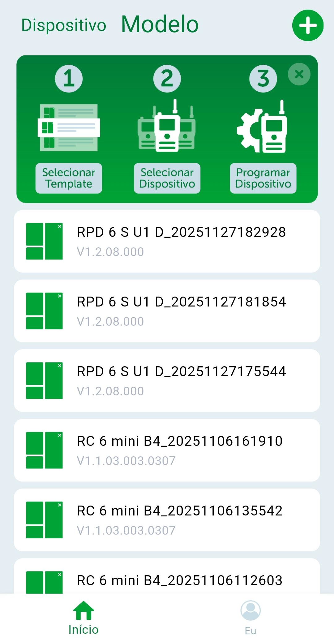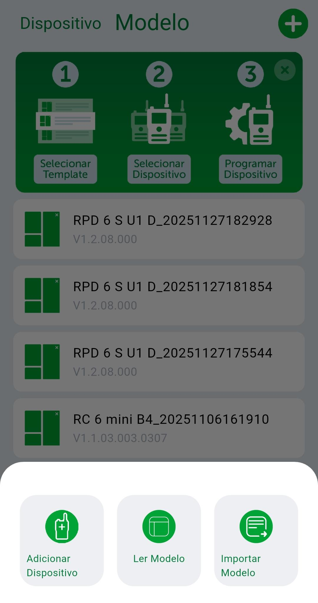 Para importar um backup para o aplicativo, acesse a tela "Modelo", e então na parte superior da tela, pressione no ícone "+" será apresentado um pop-up com algumas opções. Escolha a opção "Importar modelo" para escolher o arquivo de backup e importar para o aplicativo. Após isso o novo backup ficará disponível na lista de backups