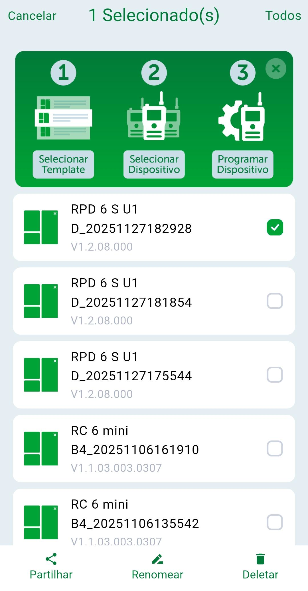 Na tela inicial do RC Config, clique em "Modelo", será apresentado uma tela com todos os arquivos de backup salvos. Ao selecionar um backup será apresentado a tela de configurações caso deseje alterar alguma configuração do backup, em seguida, pressione em "Enviar" para selecionar os rádios que receberão o backup e enviar as configurações.