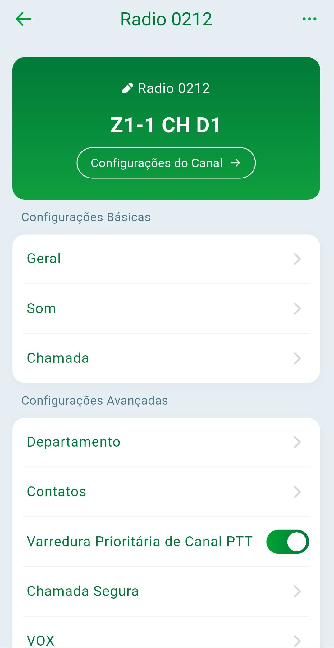Na parte de "Configurações avançadas" na tela inicial de configuração, é possível realizar a configuração de Contatos, criptografias, Vox e entre outros.