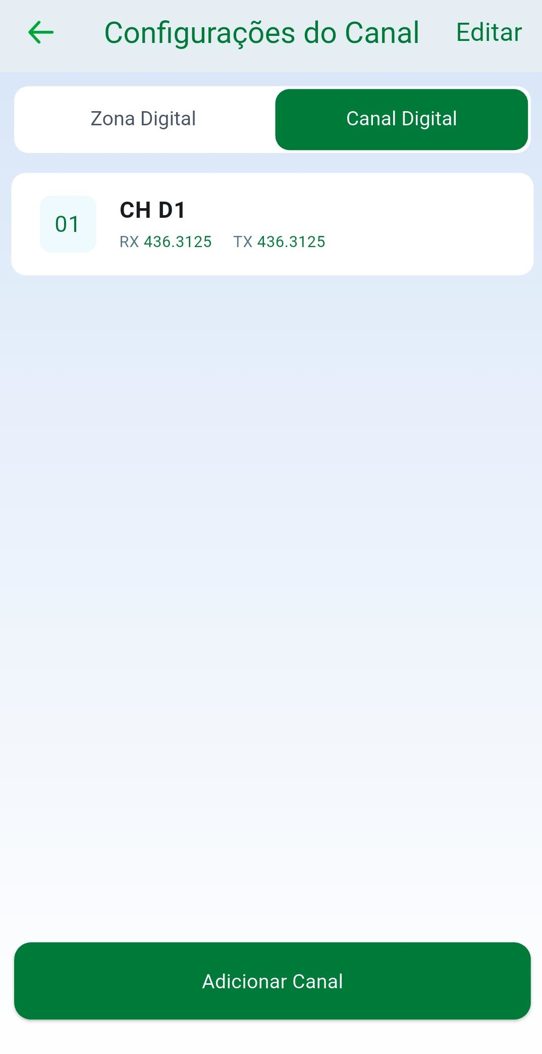 Espaçamento de canal (kHz) [Analógico]: Permite definir o espaçamento de canal utilizado pelo rádio entre 12,5 , 20 e 25 kHz.