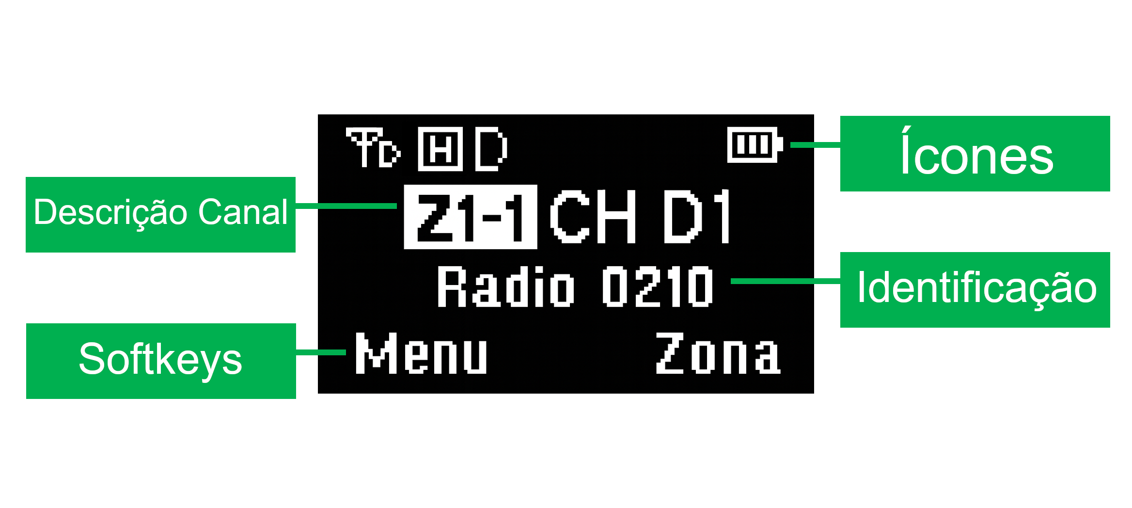 | Display | Apresenta informações de status do rádio, canais e navegação no menu. | |